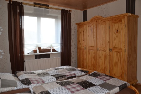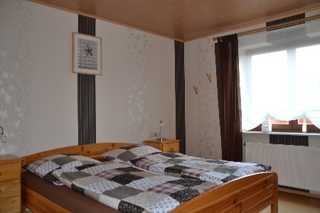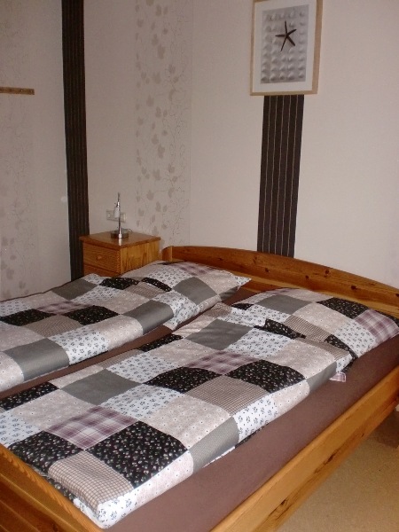 Freundlich gestaltetes SchlafzimmerDas Bett hat eine Größe von 2 x 2 m